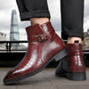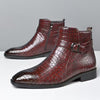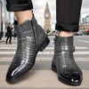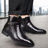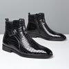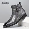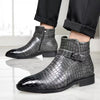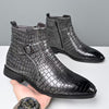 Mid-top laarzen met een opvallend getextureerd bovenwerk in krokodillenleerlook. Deze laarzen zijn vervaardigd uit soepel PU-materiaal, hebben een elegante puntige neus en een praktische zijrits voor gemakkelijk aan- en uittrekken. De gespsluiting op de schacht voegt een stijlvol detail toe, terwijl de glanzende afwerking zorgt voor een moderne uitstraling. Geschikt voor zowel casual als feestelijke gelegenheden, en ontworpen voor alle seizoenen.