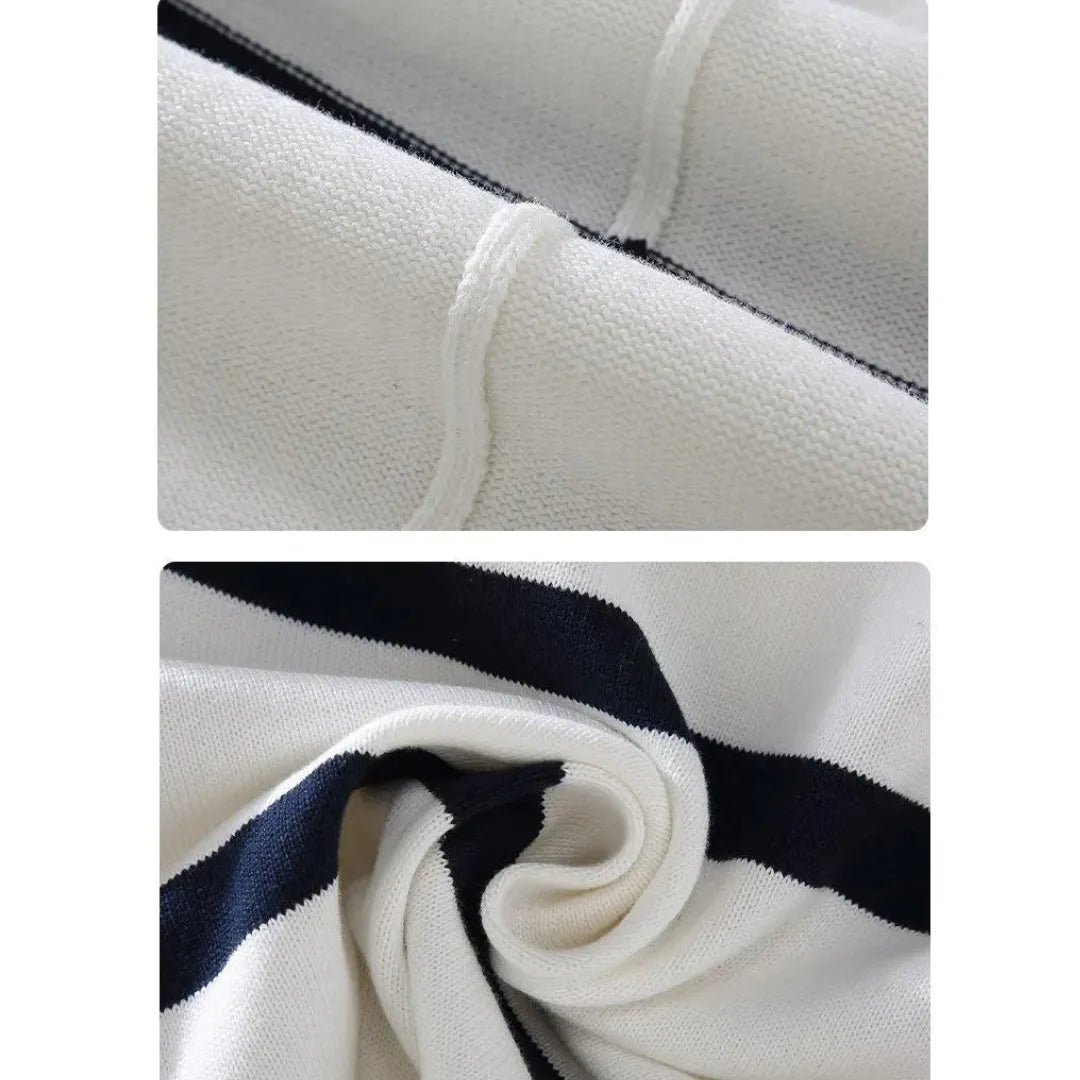 This quarter-zip sweater features a standing collar and a striking striped pattern in black and white. The soft fabric feels comfortable, while the regular fit allows freedom of movement. Long sleeves with ribbed cuffs and a metal zipper give the design a casual look, ideal for everyday wear in autumn.