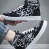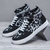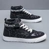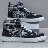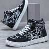 Hoge sneakers met een opvallend grafisch patroon op het zwarte kunstleren bovenwerk en een stevige rubberen zool bieden een moderne streetwear-uitstraling. De vetersluiting zorgt voor een goede pasvorm, terwijl de zachte, comfortabele voering en hoge schacht extra enkelsteun geven. Ideaal als casual schoenen voor dagelijks gebruik en buitenactiviteiten.