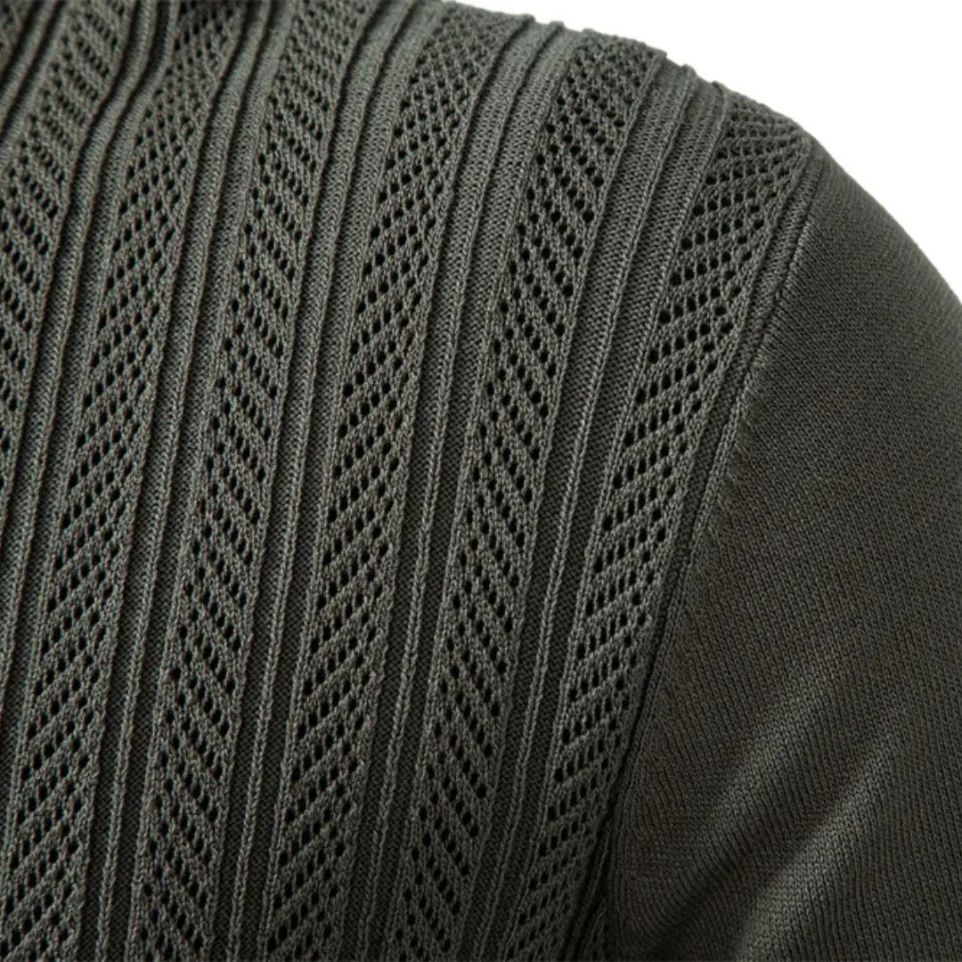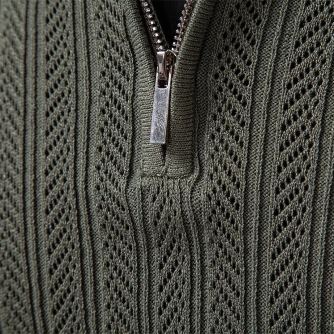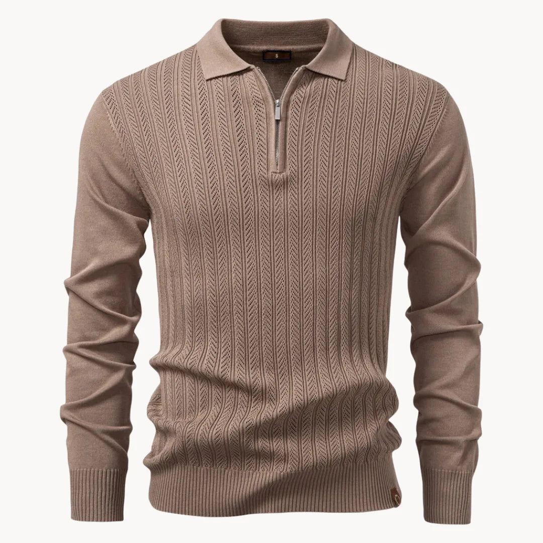 Polo met ribgebreid patroon en korte ritssluiting, uitgevoerd in een zachte stof met subtiele structuur. De klassieke kraag en lange mouwen geven een verzorgde uitstraling, terwijl de elastische boord aan onderkant en mouwen zorgt voor een comfortabele, regular fit. Ideaal voor een smart casual look en geschikt als laagje in het tussenseizoen.